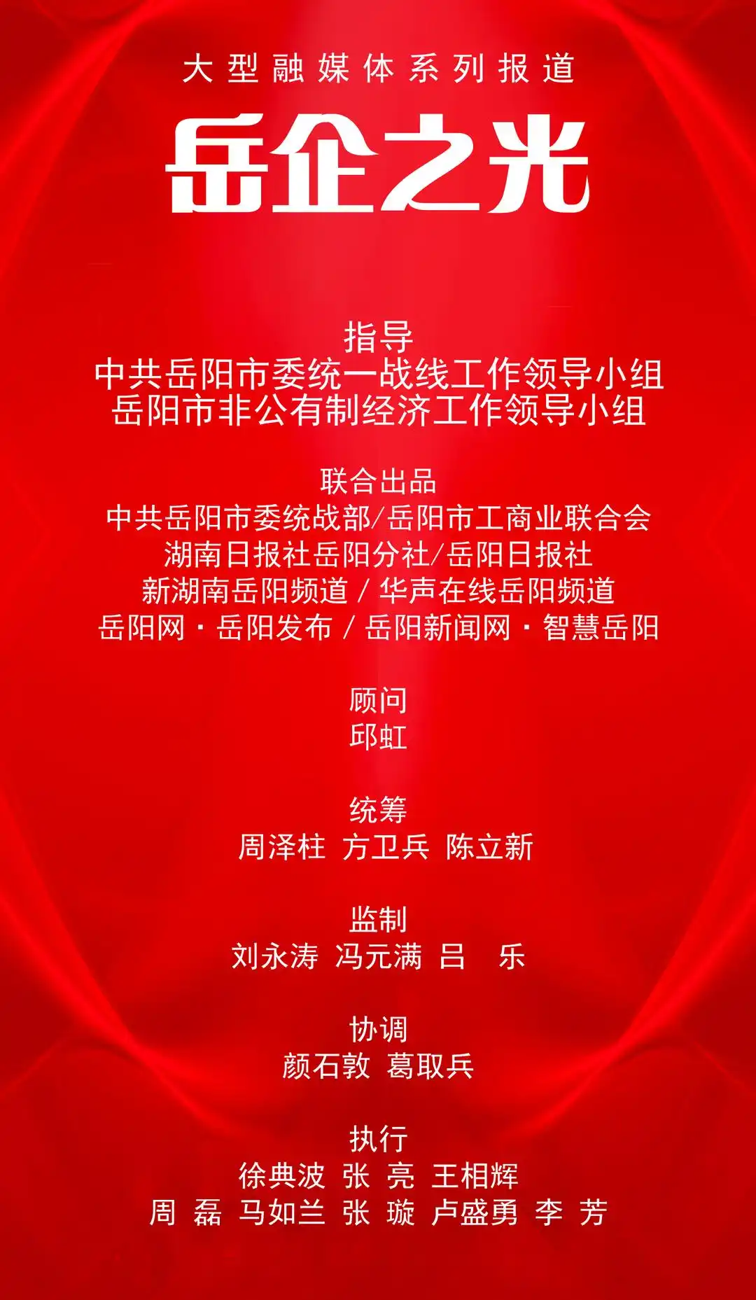 从7月25日起,在岳阳市委统战部大力支持下,岳阳市工商业联合会联合湖南日报社岳阳分社重磅策划,联动岳阳日报社、岳阳广电、新湖南岳阳频道、华声在线岳阳频道、岳阳网·岳阳发布、岳阳新闻网·智慧岳阳等主流媒体平台立体传播,倾情推出“岳企之光”大型融媒体系列报道,全方位、多视角、立体化呈现岳阳企业家的家国情怀、创业精神、先进事迹,同心共绘岳阳民营经济高质量发展的壮美新画卷。敬请关注。