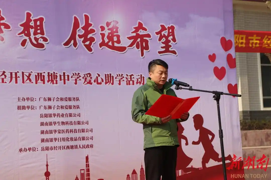 作为民营企业家,陈冲还热心公益事业,肩负社会责任感。近5年,他在岳阳市经开区西塘中学、岳阳市平地中学及高城明德小学扶贫助学、教育基金以及社会敬老关怀等方面累计捐款捐物200余万元。今年,湖南银华棠医药科技有限公司向岳阳市红十字会捐款70万元。